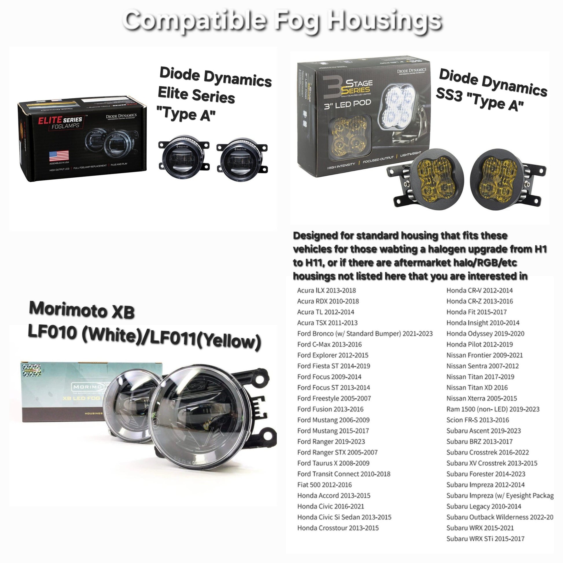 This kit uses a conversion bracket and spacers to adapt to one of the most common 2 ½” fog light housings on the market, unofficially called “Type A”. These are used in most modern Hondas, Fords, and Subarus. See diagram below for more info