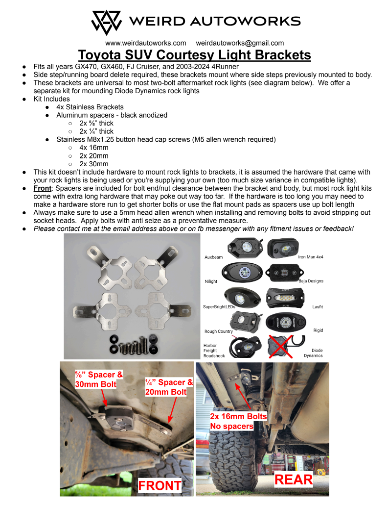Brackets/hardware only, plug and play courtesy lights/switchable harnesses for models like GX470/460 are planned for release in 2025