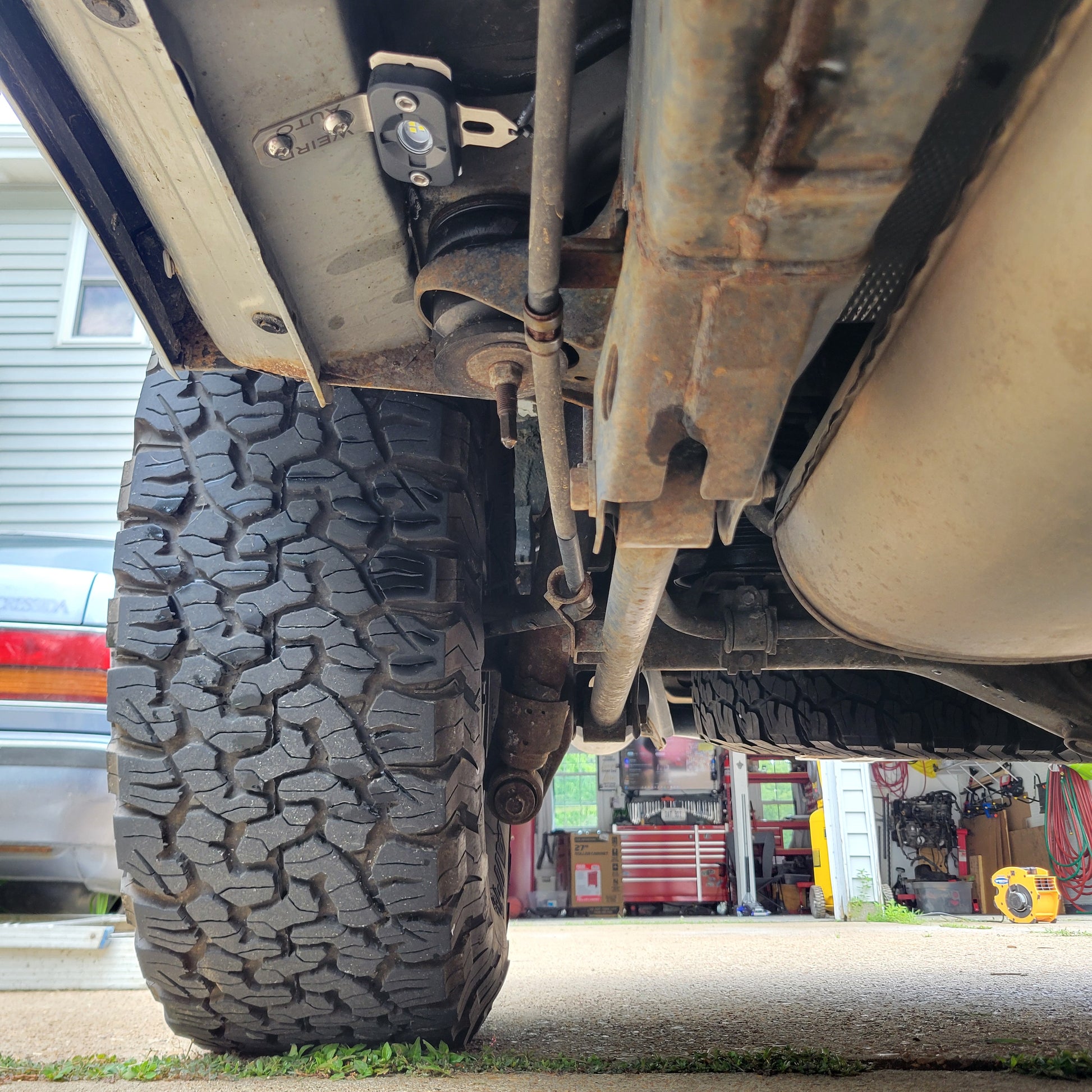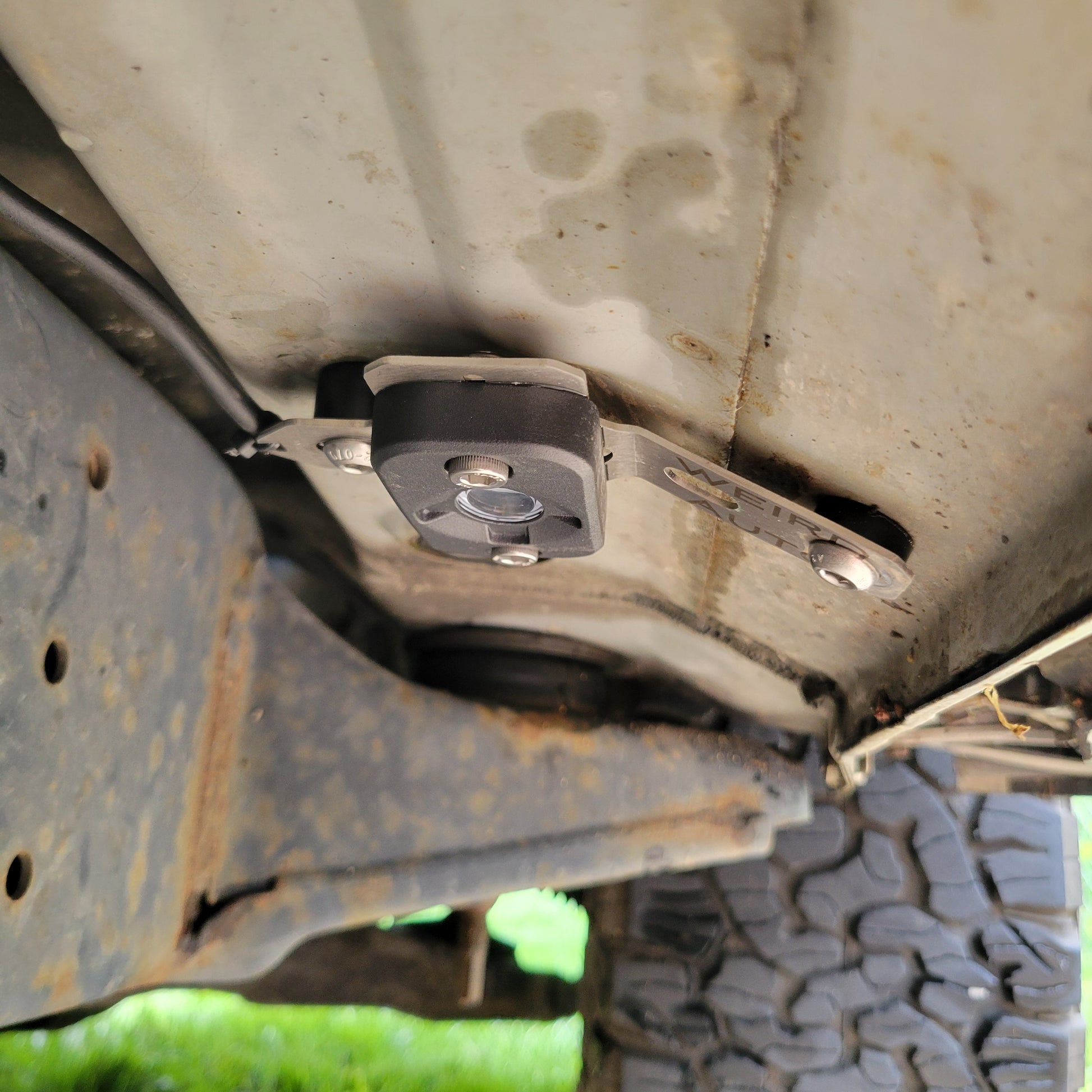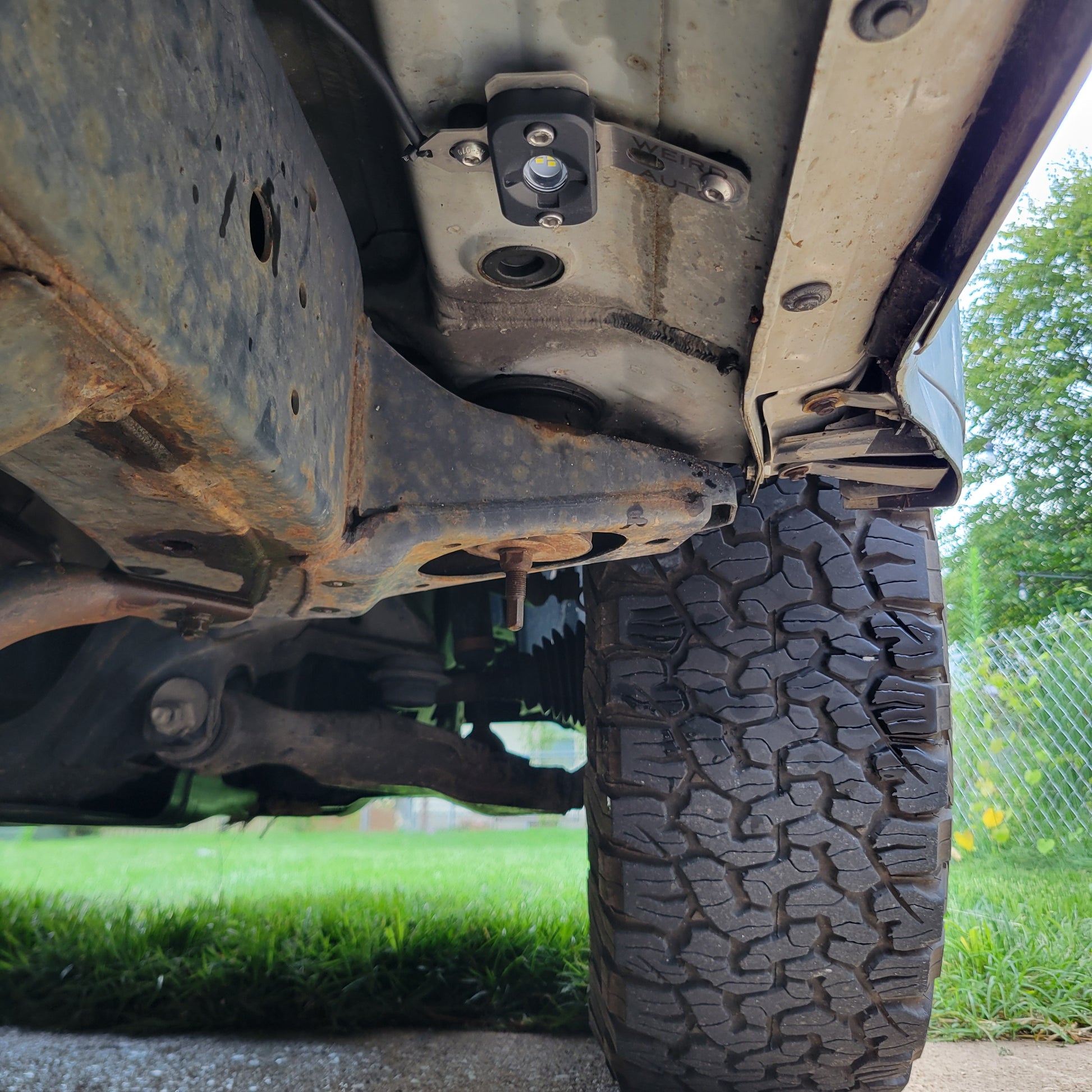There are three potential spots (front, center, rear) underneath below the doors where you can use these brackets to mount lights, the front position requires spacers/longer hardware. This kit is offered in 3 configurations: Center Only (2x), Front & Rear (4x), and All Three (6x)
