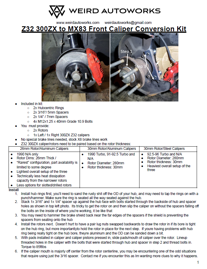 Everything needed to adapt Nissan 300zx 4-piston front calipers and rotors to Toyota Cressida MX83 (89-92) and any of the X8 JDM variants. See instructions for reference info on 300zx caliper/rotor differences.